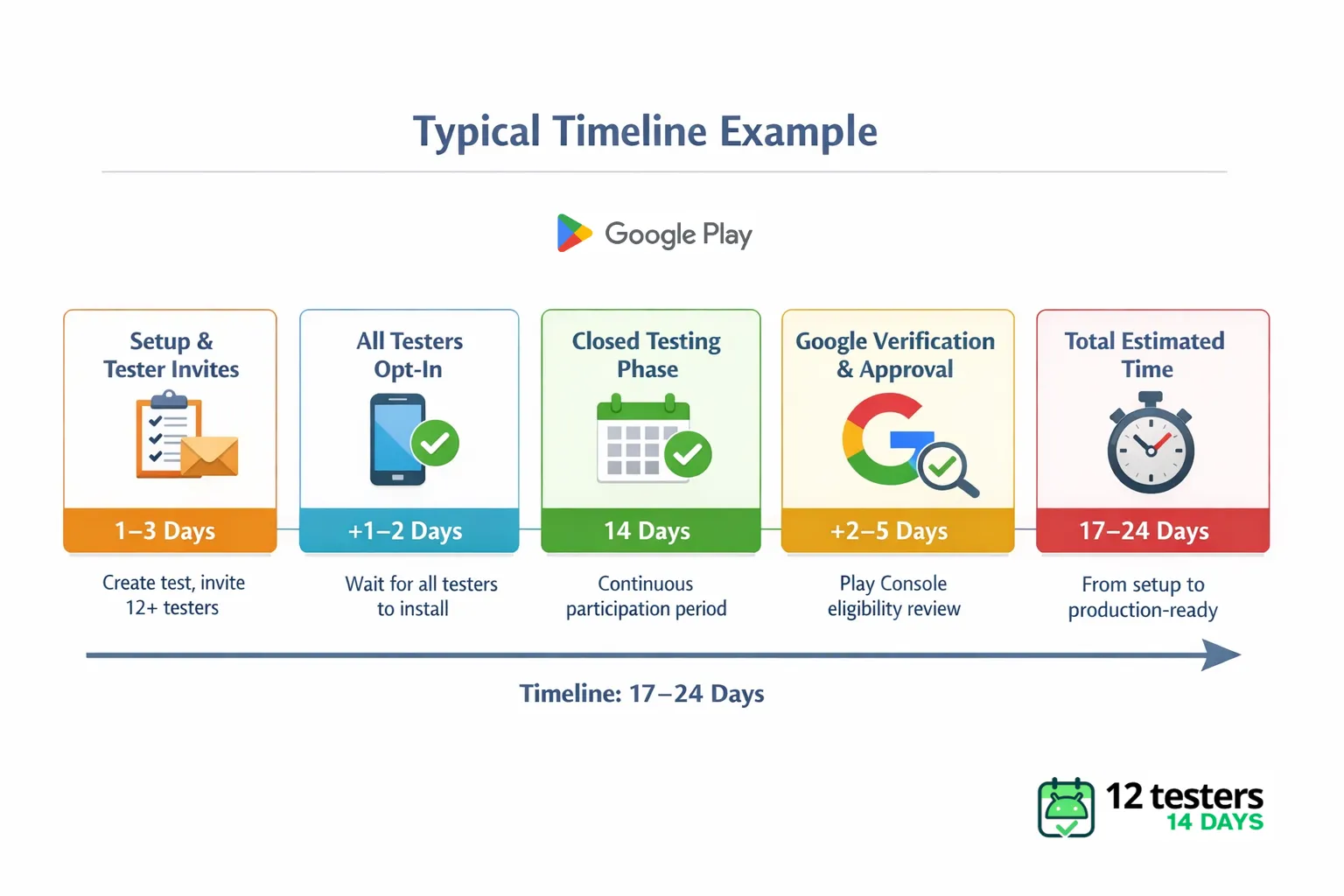 However, real-world approval can take 16–20 days total, depending on tester participation, engagement quality, and Google’s post-test review time.